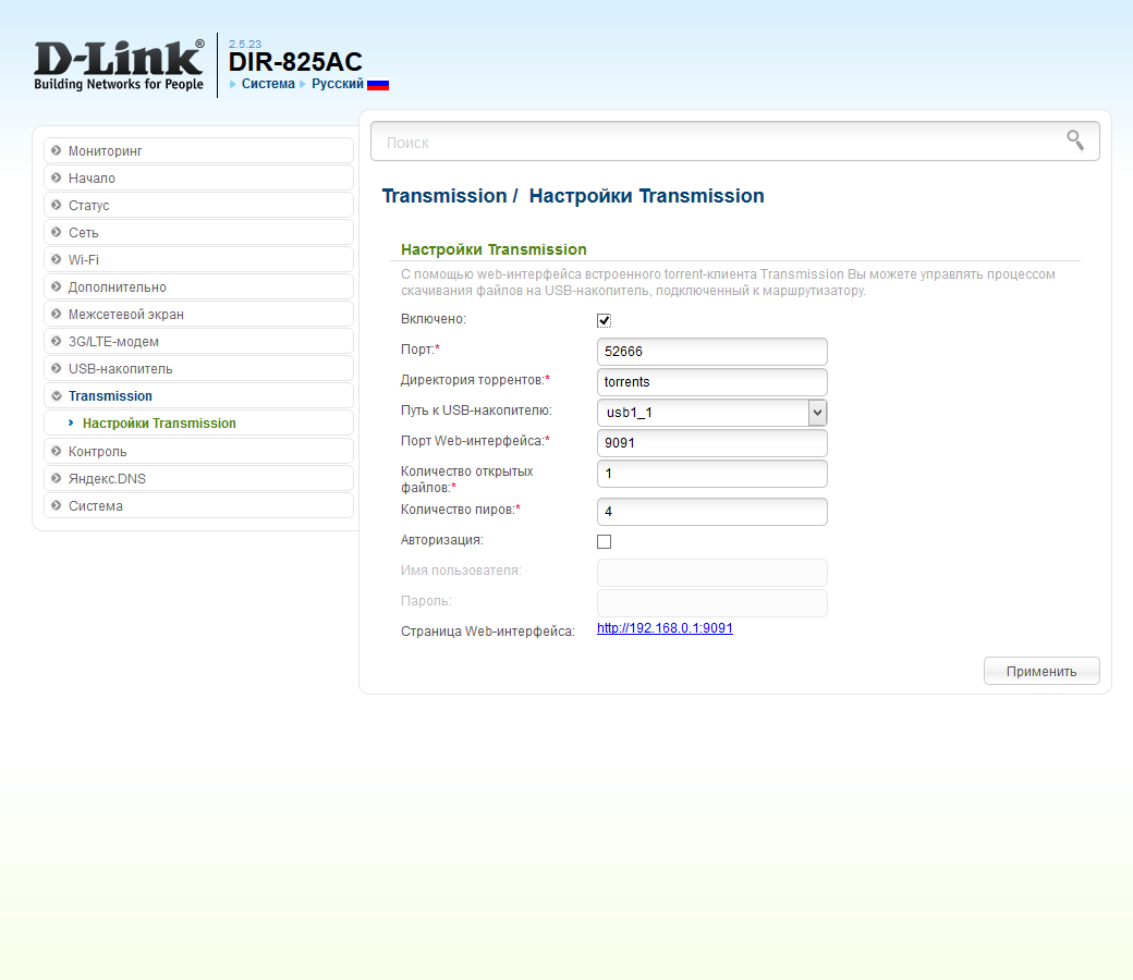 Еще один популярный модуль — программа Transmission для автономной загрузки файлов из сетей p2p. Его рабочие файлы, включая настройки, устанавливаются в одноименную папку, создаваемую на один из томов. В опциях можно выбрать некоторые из параметров сервиса, в частности имя папки, порт веб-интерфейса управления и максимальное число пиров. Остальные опции можно будет в дальнейшем изменить через настройки самой программы.