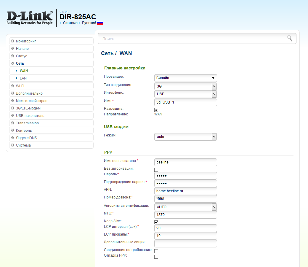 Ну и про устаревший режим PPP (например, для модема Huawei E156G) тоже не забыли, хотя высоких скоростей от него ожидать не стоит.