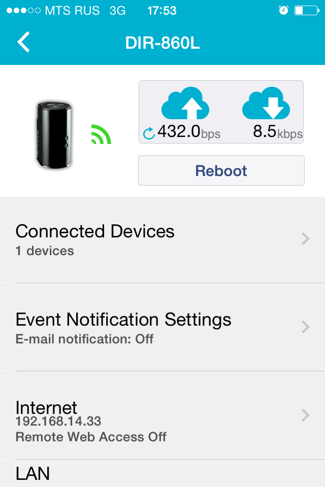 Для мобильных устройств на операционных системах Android и iOS компания предлагает две утилиты, доступные в соответствующих магазинах приложений. Для их работы потребуется завести аккаунт mydlink и указать его в роутере. Программа mydlink Lite используется для осуществления некоторых операций с устройством и его настройками. В частности, в ней можно увидеть статус устройства, включая текущие скорости, подключенных клиентов, данные подключений к интернету и других интерфейсов.
