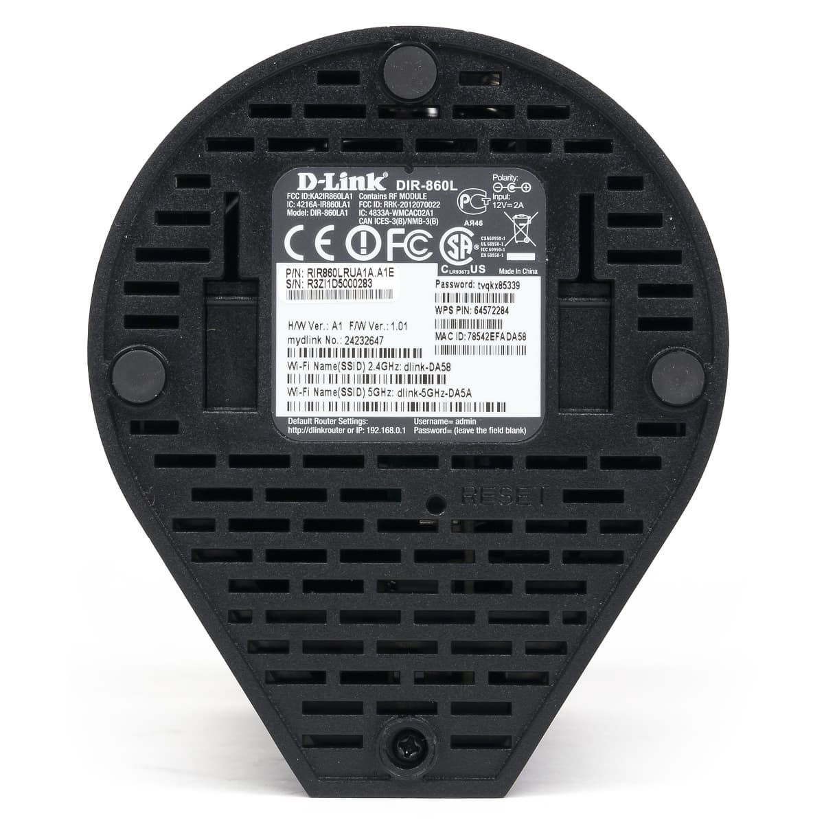 На верхнем торце мы видим решетку вентиляции, а вставка в центре имеет круговой узор. На ней же светлой краской указано название модели. Аналогичные решетки находятся и на дне устройства. Здесь же есть четыре невысокие резиновые ножки, отверстие скрытой кнопки сброса, табличка с информацией об устройстве (включая имена и пароли беспроводных сетей).