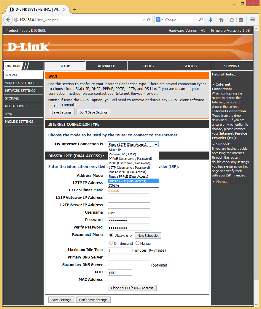 Для подключения к интернету можно использовать помощника или установить опции в ручном режиме. Устройство поддерживает работу с IPoE, PPPoE, PPTP и L2TP. Есть специальные режимы для России с сохранением доступа к сети провайдера при работе через сервер VPN. Из дополнительных опций упомянем изменение MTU и MAC, включение ответа на ping для внешнего интерфейса, принудительный выбор скорости порта WAN, включение поддержки мультикаст.