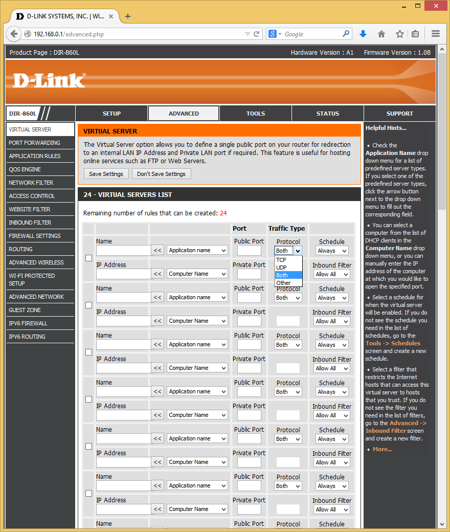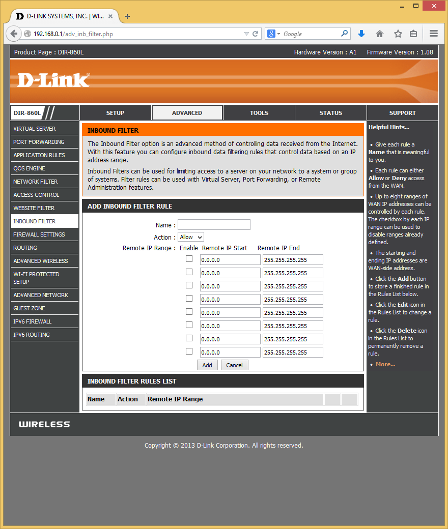 Фильтры адресов («Inbound Filter») не только работают с правилами трансляции портов, но и могут помочь ограничить удаленный доступ к интерфейсу системы. Правил может быть несколько, в каждом из них указываются диапазоны IP-адресов и действие — разрешение или блокировка.