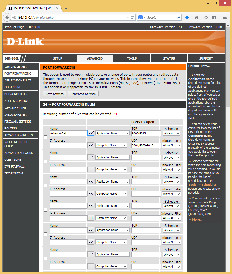 Доступность внутренних сервисов для клиентов из интернета обеспечивается механизмом трансляции портов. Для этого есть две таблицы — одна для одиночных портов, а вторая для диапазонов. Обе имеют объем в двадцать четыре записи.