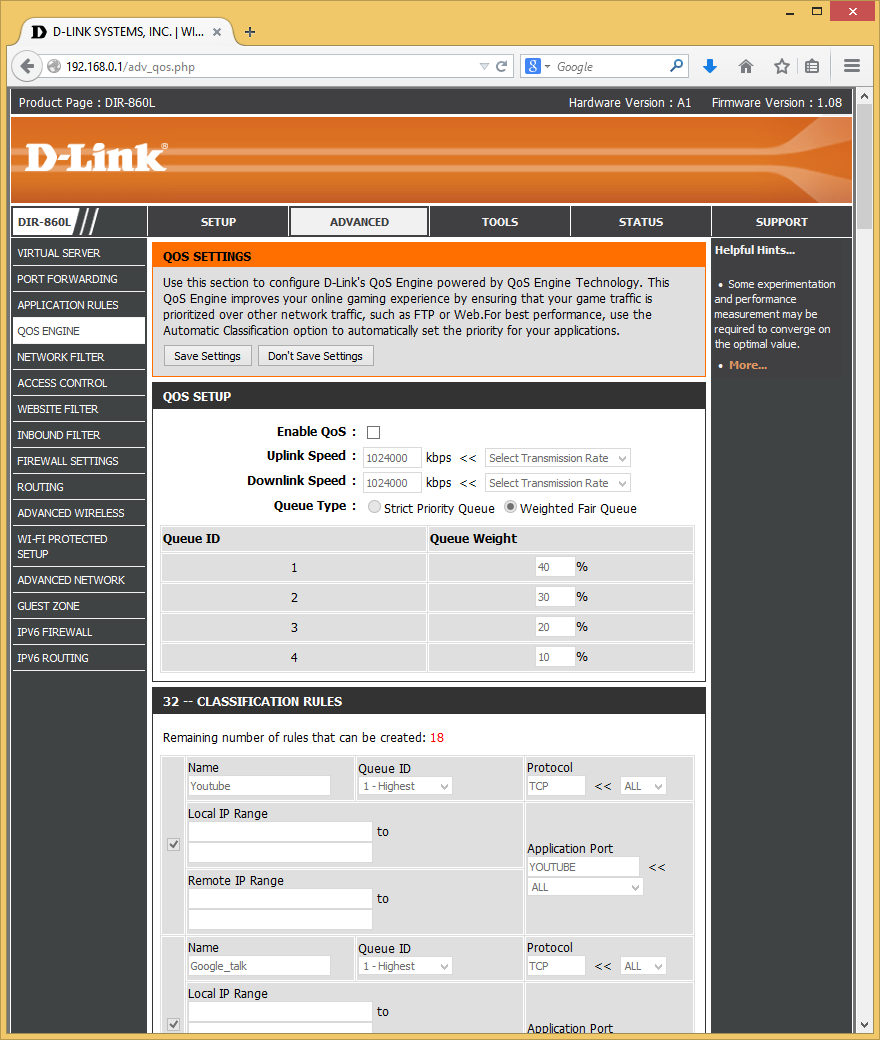 В роутере реализована система управления трафиком (QoS). Пользователь может определить до 32 правил выделения фильтрации трафика в группы приоритета по адресам клиентов и серверов, портам или предопределенным протоколам. На практике активация данной системы приводит к значительному падению скорости маршрутизации. Так что, как и на большинстве устройств данного класса, эта функция не имеет большого практического значения.