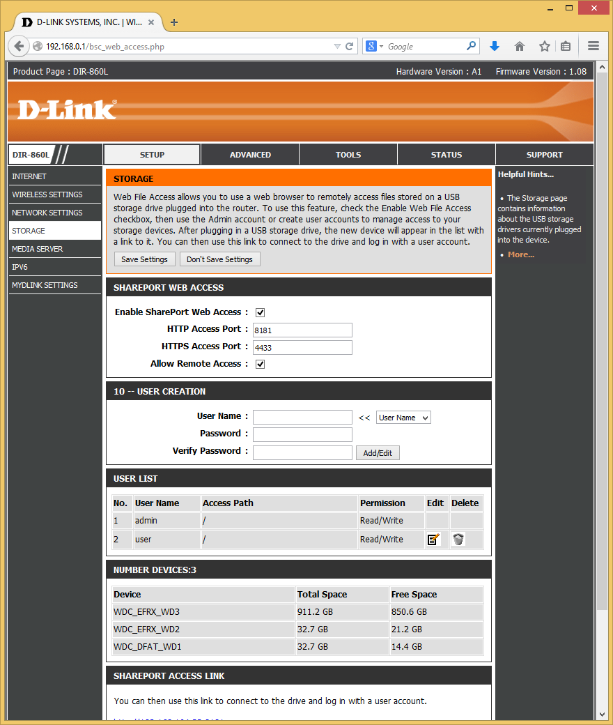 Доступ к накопителю осуществляется через стандартное сетевое окружение Windows или через веб-браузер. Последний вариант, названный производителем SharePort Web Access, позволяет реализовать и удаленный доступ к документам. Кроме того, он поддерживает протокол HTTPS и возможность изменения номеров портов. Кроме стандартного варианта организации данных по каталогам, при работе через браузер предусмотрена автоматическая группировка по типу файла для мультимедиа и документов. Предусмотрена также опция поиска. Кроме чтения, пользователю доступны операции создания новых папок, удаления и загрузки файлов.