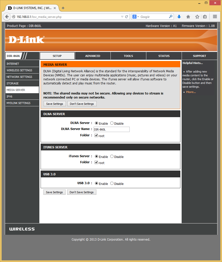 Подключаемые винчестеры можно использовать для организации медиабиблиотеки с доступом по протоколам DLNA и iTunes. Данные сервисы имеют минимум настроек — только выбор корневой папки для индексации файлов. DLNA поддерживает работу с файлами форматов JPEG, MP3, M4A, WMA, FLAC, WAV, AVI, MKV, MOV, MP4, MPEG, WMV и другими. Совместимые форматы для iTunes включают MP3 и M4A. Для корректного чтения тегов в MP3 они должны быть записаны в уникоде. Никаких средств мониторинга работы сервисов нет.