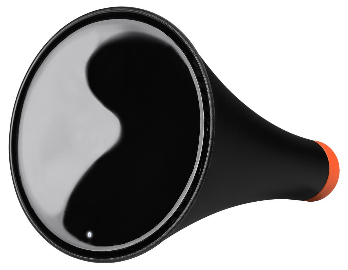 Основная часть корпуса моста изготовлена из черного матового пластика. Фронтальная сторона, похожая на диффузор динамика, имеет глянцевое покрытие черного цвета. В нижней ее части находится почти незаметное отверстие двухцветного светодиодного индикатора. Мигает он только при настройке устройства, а в рабочем режиме горит белым. При необходимости его можно и совсем отключить через веб-интерфейс.