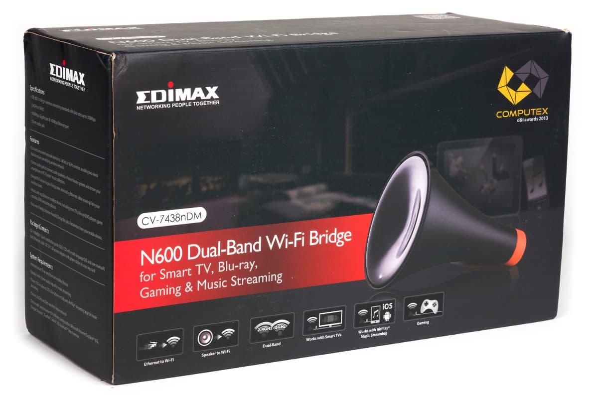 Несмотря на то, что все больше устройств сегодня оборудовано встроенным беспроводным контроллером, использование внешнего моста имеет определенные преимущества. В частности, рассмотренный Edimax CV-7438nDM интересен поддержкой двух диапазонов и скорости 300 Мбит/с. Кроме того, модель имеет оригинальный дизайн, два сетевых порта и возможность вывода звука по протоколу AirPlay.