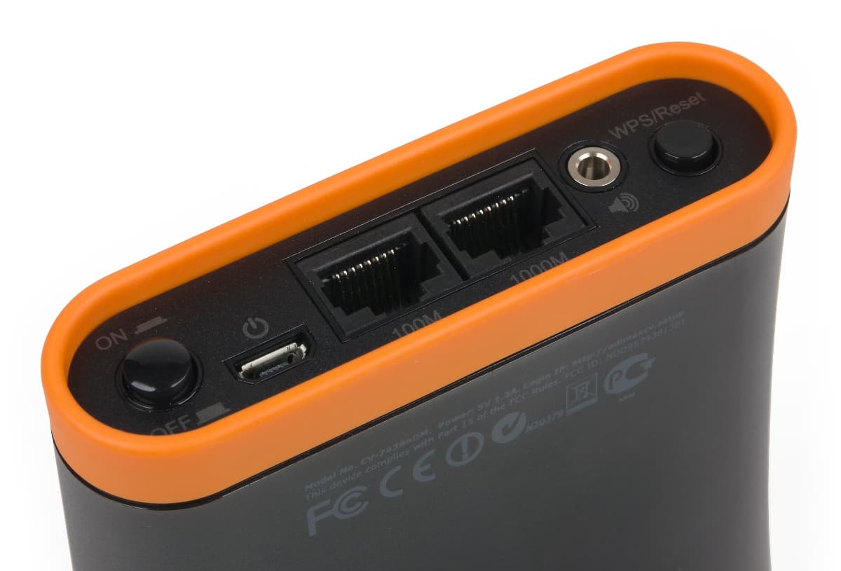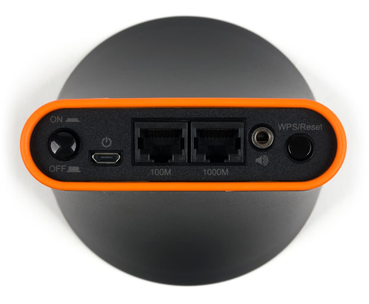 Задняя «сплюснутая» часть имеет прорезиненный оранжевый ободок, который добавляет яркую нотку и придает устойчивости. На ней находятся выключатель и разъем (Micro-USB) питания, два сетевых порта (на 100 Мбит/с и 1000 Мбит/с), аудиовыход (миниджек 3,5 мм) и кнопка, реализующая функции подключения к сети по технологии WPS и сброса настроек.