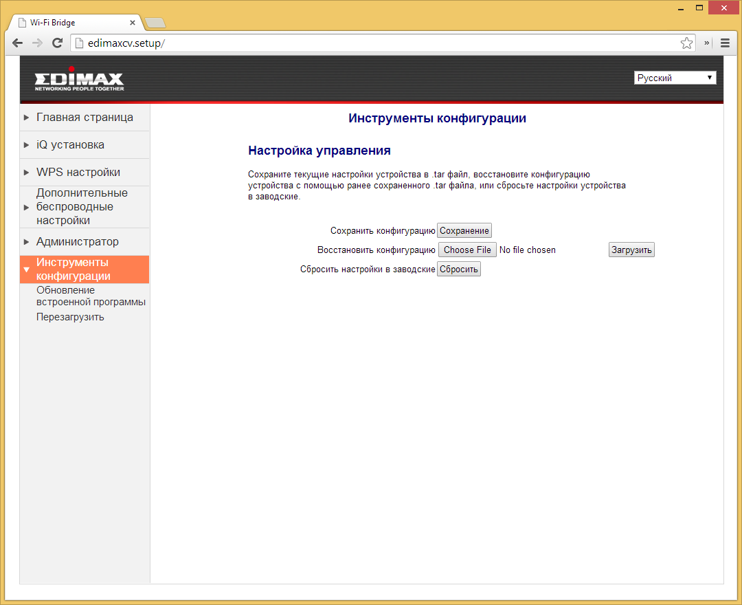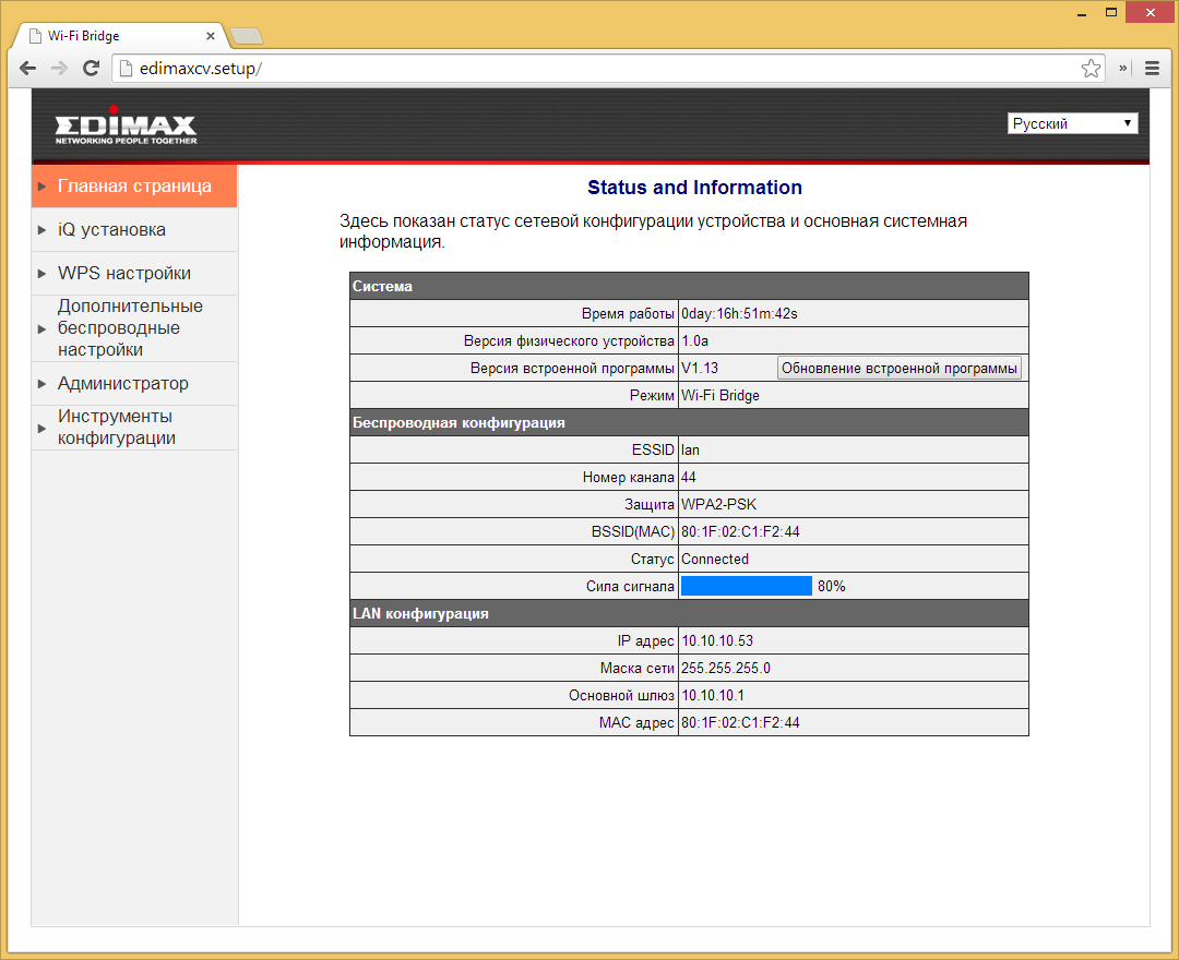 Стоит заметить, что данная модель работает именно как полностью прозрачный мост: подключаемые к ней клиенты будут взаимодействовать с DHCP-сервером основного роутера для получения настроек IP-адресов. Устройство также будет иметь собственный адрес, через который в дальнейшем можно будет обратиться к его веб-интерфейсу. Он представлен на нескольких языках, включая русский. Настроек у устройства совсем немного.