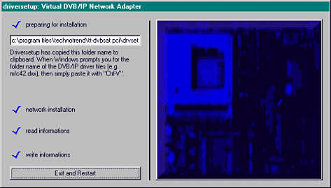 Если в процессе автоконфигурации Virtual DVB/IP Network Adapter программа не сможет найти путь к файлу "MFC42.Dxx", то укажите путь к нему самостоятельно. Установка программного обеспечения для карты SkyStar1 завершена, и Вам необходимо перезагрузить компьютер. После перезагрузки компьютера проверьте корректность установленных устройств на вкладке "Устройства".