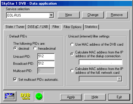 Если поток данных Multicast (мультивещательный) имеет одинаковый PID, имеет смысл ввести этот PID здесь. Информационное приложение SkyStar1 в этом случае может установить правильный PID автоматически. В противном случае поле следует оставить пустым (0).