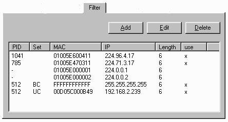 Диалоговое окно Filter Settings (Установки фильтров) открывается при нажатии кнопки Edit или двойном нажатии на PID фильтра, параметры которого вы хотите изменить, в списке фильтров. Поля ввода содержат установки фильтра. Измените их, где требуется. После нажатия OK установки фильтра изменяются. При нажатии Cancel все изменения не сохраняются.