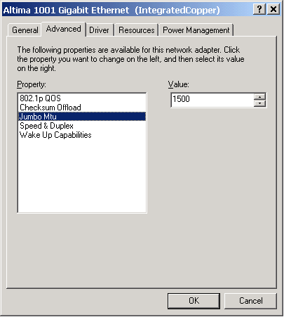 На сайте компании новые драйверы тоже отсутствовали, поэтому для Windows использовались драйверы версии 3.12.0.0, поставляемые с картой. Драйвер предоставляет не очень много опций для настройка адаптера. Размеры Jumbo Frame задаются дискретно и принимают значения 1500, 2000, 3000 и 4000. Выше нельзя.