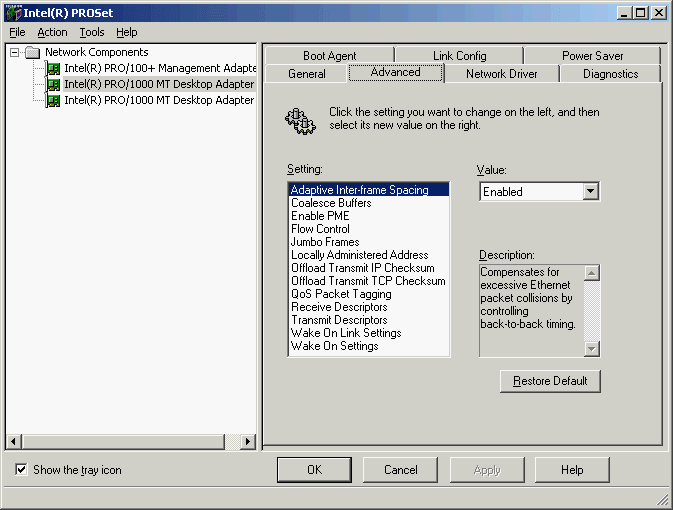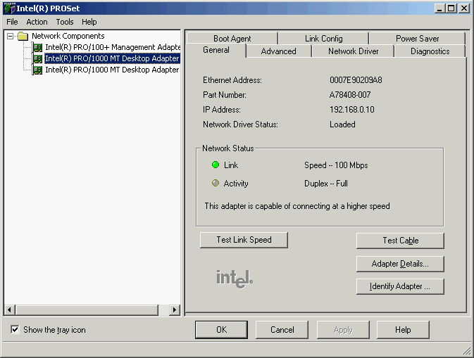 B последняя в этом обзоре карта — Intel PRO/1000 MT Desktop от Intel Corporation. Она уже тестировалась в предыдущем обзоре, но теперь протестирована заново на новых версиях драйверов.