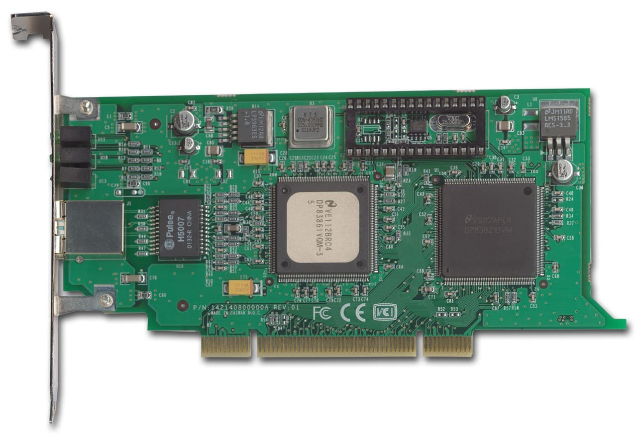 А вот микроконтроллеры установленные на этих картах, и являющиеся 10/100/1000 Мбит Ethernet контроллерами, связывающими сетевую карту с шиной PCI, различаются в зависимости от битности шины PCI. На 64-битных адаптерах установлены контроллеры DP83820BVUW, на 32-битных — DP83821BVM. В принципе, их единственное глобальное отличие, это разрядность PCI шины, с которой они работают. Остальные характеристики одинаковы: