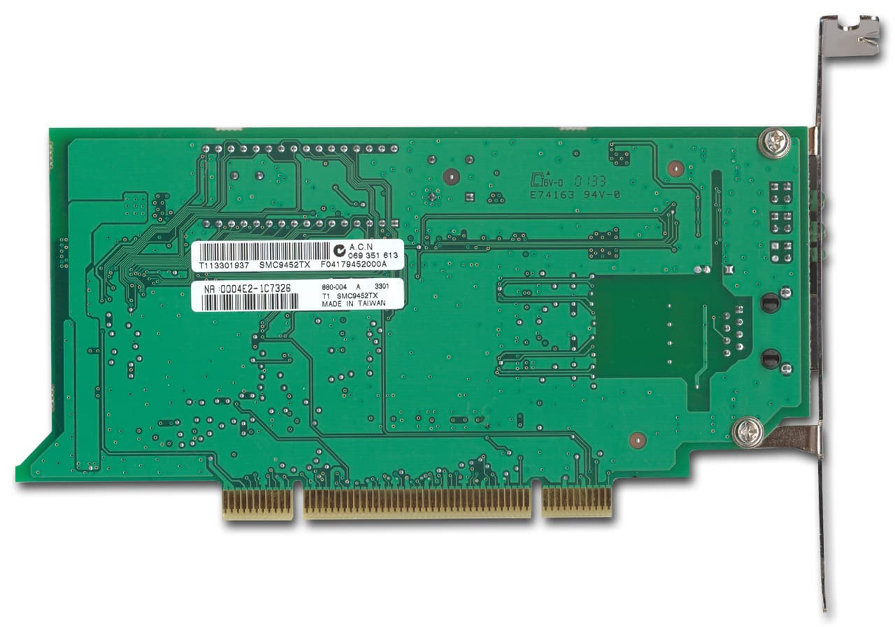 Карта SMC9452TX обладает 32-битным интерфейсом PCI и имеет 5 индикаторов, три из которых сообщают о скорости работы, а два оставшиеся о наличии линка и активности. У обоих адаптеров интересный дизайн PCB — со стороны интерфейсного Ethernet разъема наблюдается небольшой срез, а с другой стороны — непонятный выступ. Хотя после внимательного рассмотрения плат становится ясно, что это сделано для экономии текстолита.