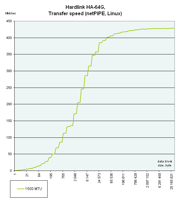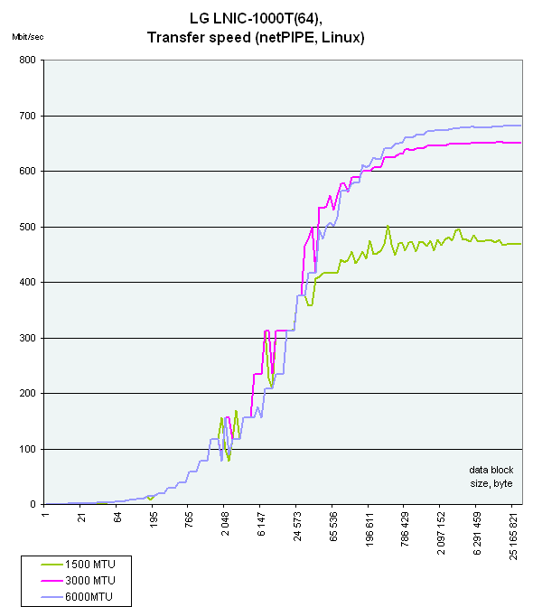 В ОС Linux для генерации трафика и снятия показаний использовалась программа netPIPE версии 2.4. Программа осуществляет генерацию трафика с постепенно возрастающим размером пакета данных (пакет размера N передается несколько раз, количество передач обратно пропорционально его размеру, но не меньше семи). Эта схема позволяет наглядно увидеть процент использования канала в зависимости от размера передаваемых данных.