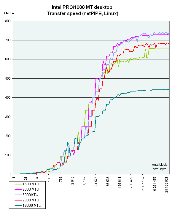Ожидаемая картина у всех карт, кроме Intel PRO/1000 MT Desktop. Видимо, программисты не до конца потрудились — С увеличением размера Jumbo фрейма скорость передачи данных растет лишь до определенного момента. При размере Jumbo Frame 16000, скорость почему-то резко падает. Так же наглядно видно, что отличие в скорости между одинаковыми картами, но разными PCI интерфейсами минимально.