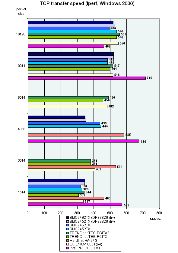 Каждый TCP тест запускался 15 раз, после чего выбирался лучший (по скорости) результат. В случае NTttcp загрузка процессора измерялась встроенными средствами программы, а в Iperf — с помощью системного монитора Windows 2000.