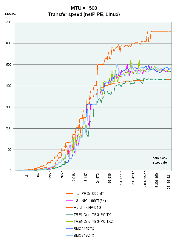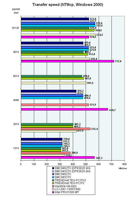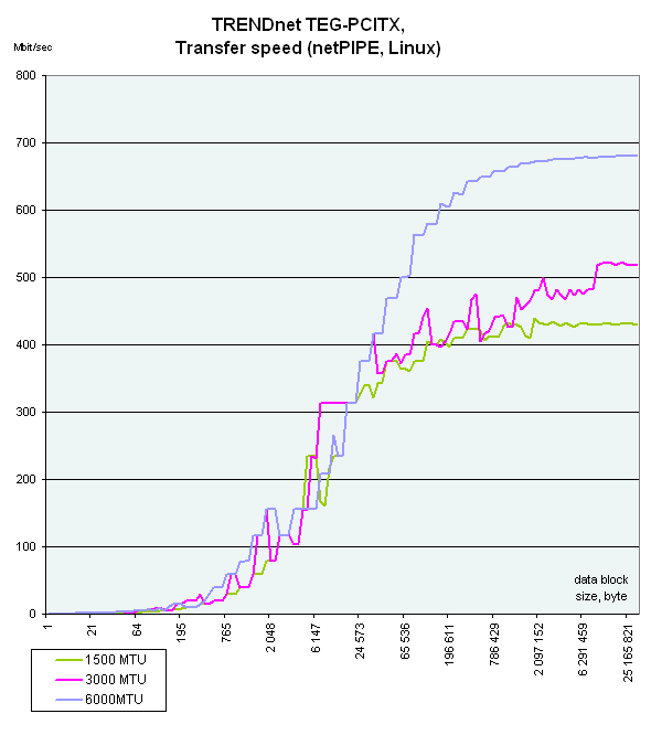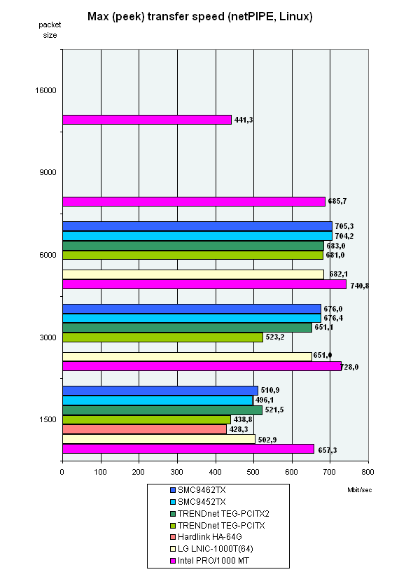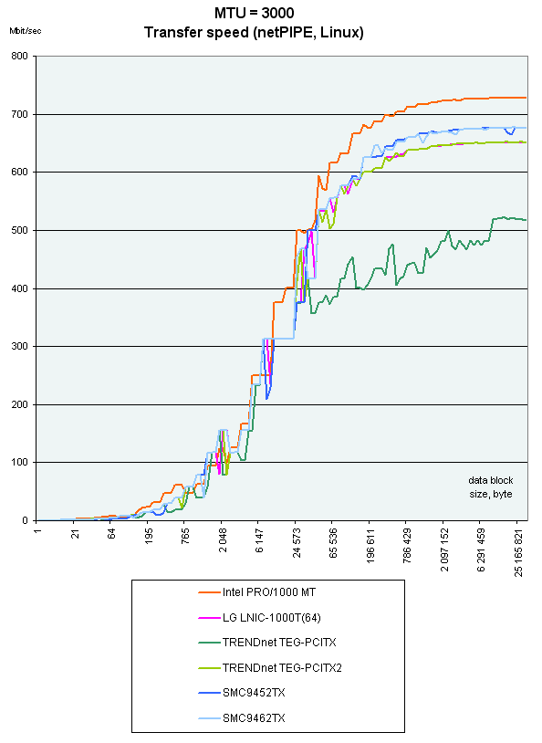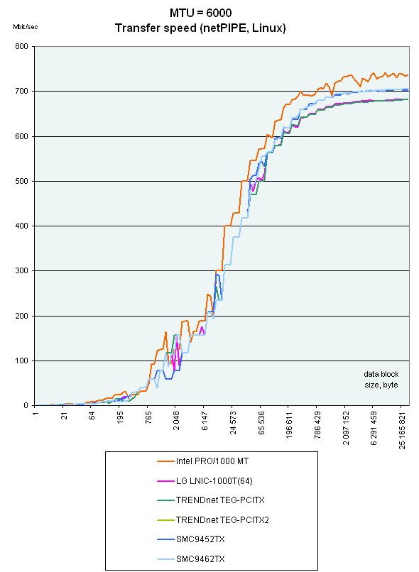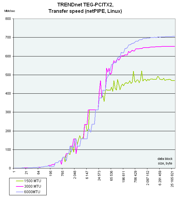 Intel PRO 1000/MT лидирует на малых размерах фреймов, но при размере 6000 все карты показывают уже приблизительно одинаковые результаты. А вот на размере Jumbo Frame в 3000 произошло абсолютно непонятное падение скорости у TRENDnet TEG-PCITX.