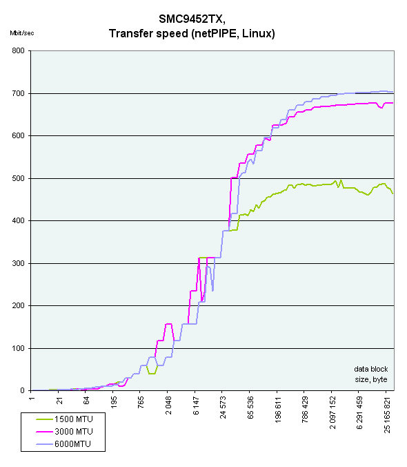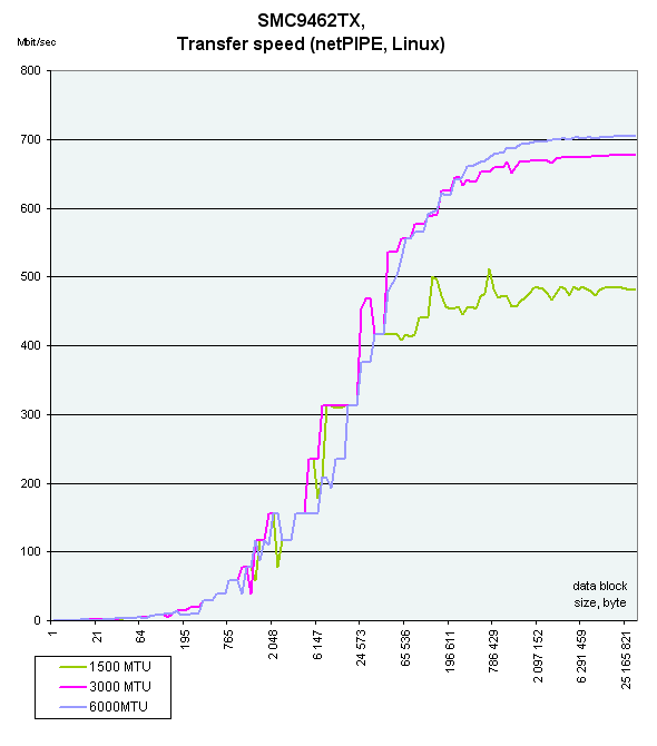 Jumbo фреймы безусловно вещь полезная, отключать их не стоит. Но скорость еще сильно зависит от драйвера, это наглядно видно на примере адаптера Intel PRO 1000/MT. По сравнению с предыдущим тестированием ее скорость возросла. И конечно мы все равно не можем достигнуть максимума (гигабита) из-за узкого горлышка — 32-битной PCI шины. Тем не менее серверные (64-битные) адаптеры были протестированы на 32-битной PCI шине для наглядного сравнения обоих версий карт между собой. Как видно из диаграмм, на 32-битной шине отличий практически нет.