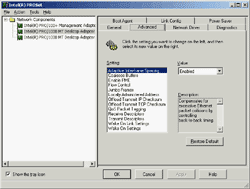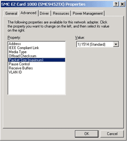 Последние версии драйверы для обоих ОС брались с сайта компании. Версия драйвера в Windows 2000 — 6.4.16, он предоставляет богатые возможности по конфигурированию адаптера. Размер Jumbo Frame задается дискретными значениями в 4088, 9014 и 16128 байт.