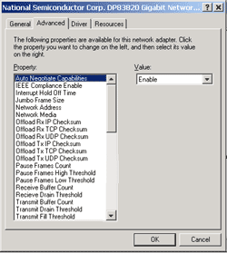 Для ОС Linux предлагаются лишь драйвера для ядра 2.2.х. В ядрах версии 2.4.х они не собираются, поэтому использовался встроенный в ОС драйвер «National Semiconduct DP83820» версии 0.18. Но в ней задан максимальный размер Jumbo Frame — 8192. Причем не правя исходный код драйвера, невозможно выставить размеры пакета, более 1500.
