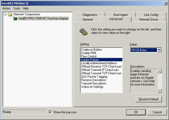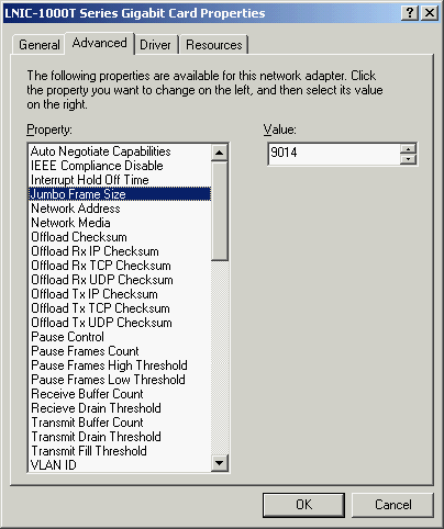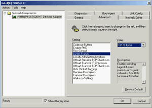 Драйверы для обоих ОС брались с сайта компании. Версия драйвера в Windows 2000 — 6.2.33.0, он предоставляет богатые возможности по конфигурированию адаптера. Тем не менее, настройки оставлялись по умолчанию. Как обычно, менялся только размер Jumbo Frame (он мог задаваться дискретными значениями: 4088, 9014, 16128 байт).
