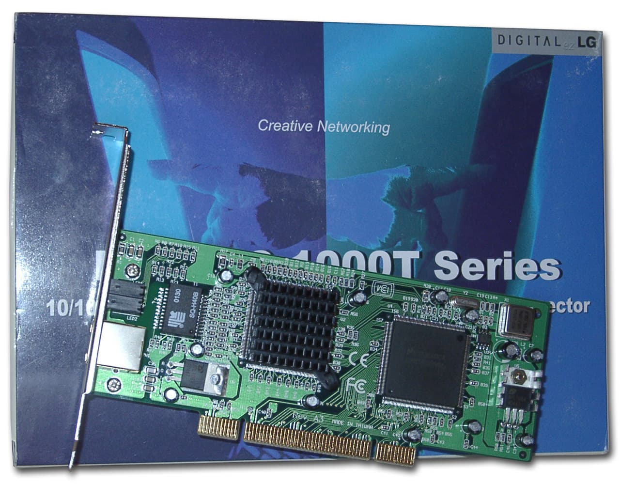 Двухчиповая карта использует микроконтроллеры от National Semiconductor Corporation. Карта имеет 6(!) светодиодных индикаторов, три из которых несут информацию о скоростях 10/100/1000 Мбит (3 индикатора), а остальные три показывают наличие коллизии, передачи данных и режима полного дуплекса. Один из контроллеров карты — DP83861VQM-3 — скрыт под радиатором. Он является трансивером физического уровня и может работать на скоростях 10/100/1000 Мбит/сек в режимах полу- и полного дуплекса. Поддерживает режим автосогласования скоростей и режимов из вышеназванного списка (IEEE 802.3u Auto-Negotiation).