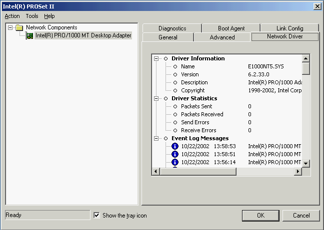 Версия драйвера в Windows 2000 — тоже 5.0.1.24. Но его интерфейс предоставляет намного меньше настроек сетевого адаптера, чем у предыдущей карты. Настройки драйвера тоже были оставлены по умолчанию. Верхний предел размера Jumbo Frame неизвестен, но максимальный используемый при тестировании размер (16128 байт) устанавливался без проблем.