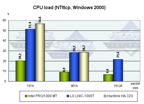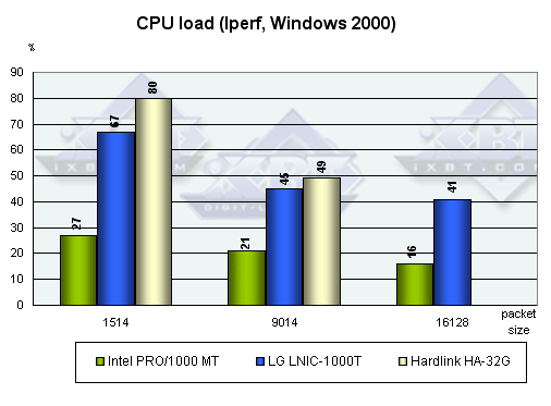 Каждый тест запускался 15 раз, после чего выбирался лучший (по скорости) результат. В случае NTttcp загрузка процессора измерялась встроенными средствами программы, а в Iperf — с помощью системного монитора Windows 2000.