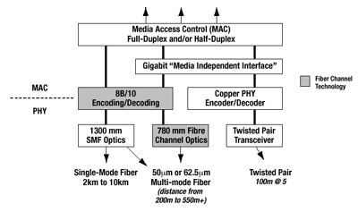 Изначально gigabit Ethernet мог использовать в качестве среды передачи только оптические кабели — интерфейс 1000BASE-X. Он основывается на стандарте физического уровня Fibre Channel (это технология взаимодействия рабочих станций, устройств хранения данных и переферийных узлов). Так как эта технология уже была одобрена ранее, такое заимствование сильно сократило время на разработку стандарта gigabit Ethernet. 1000BASE-X включает три физических интерфейса со следующими характеристиками: