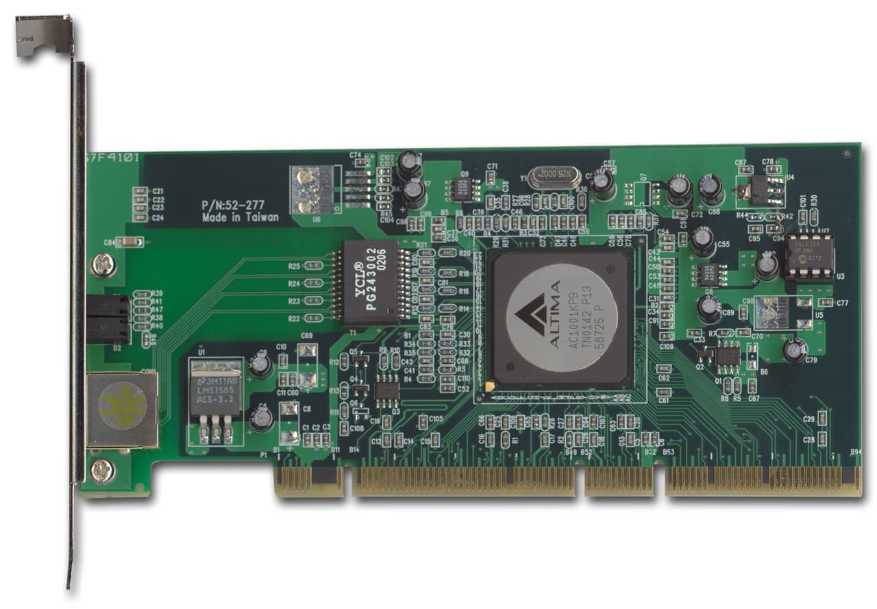 Около разъема RJ-45 адаптера установлено три индикатора, показывающих наличие линка на скоростях 10/100/1000 Мбит и режим передачи данных мерцанием. Сетевой адаптер одночиповый, в качестве Ethernet-контроллера используется AC1001KPB от AltimaCommunications