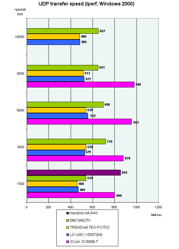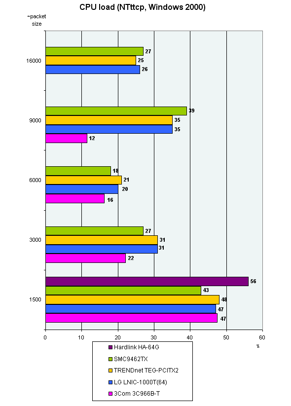 Каждый TCP-тест запускался 15 раз, после чего выбирался лучший (по скорости) результат. В случае NTttcp загрузка процессора измерялась встроенными средствами программы, а в Iperf — с помощью системного монитора Windows 2000.