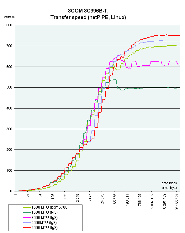Видно, что родной драйвер Broadcom для адаптера 3C996B-T сильно выигрывает в скорости по сравнению с сторонним драйвером TG3, да и в документации с родным драйвером присутствует рекомендация использовать именно его.