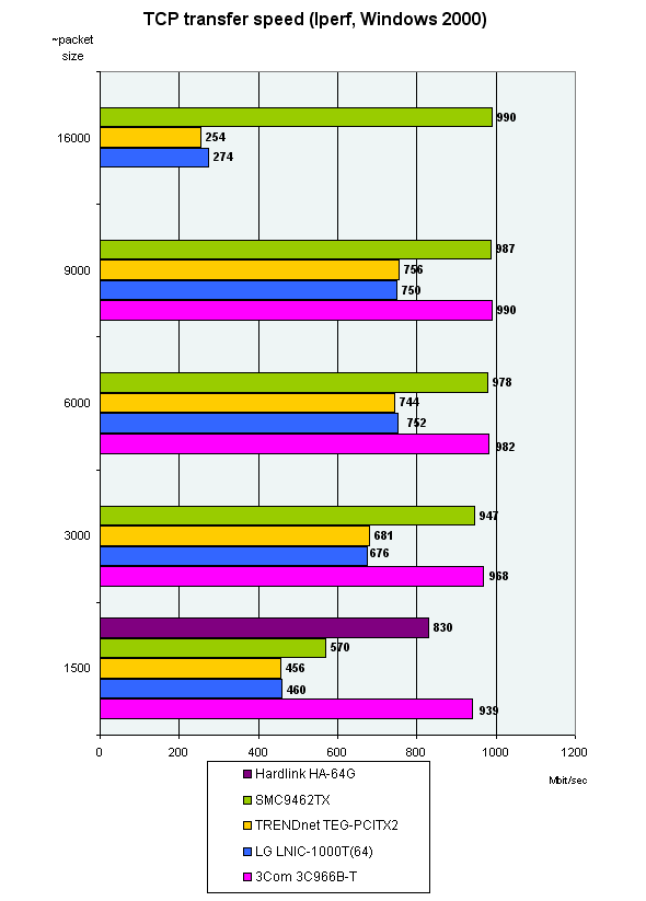 В Windows 2000 для генерации TCP-трафика и снятия показаний использовались программы Iperf версии 1.2 и NTttcp из Windows 2000 DDK. Программы запускались для снятия показателей скорости передачи данных и загрузки процессора при размерах Jumbo Frame
