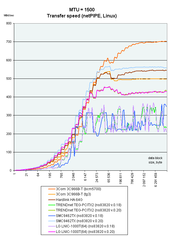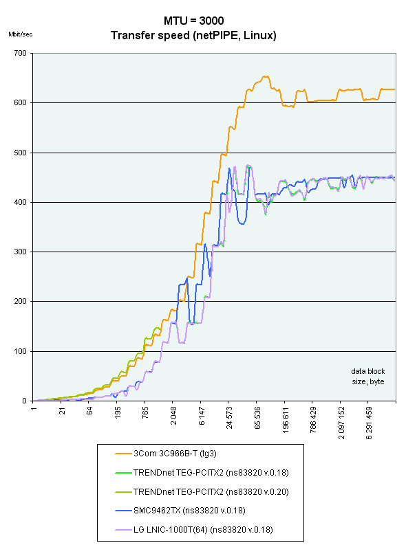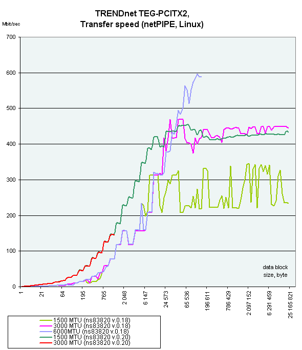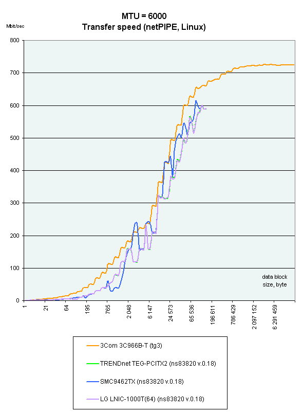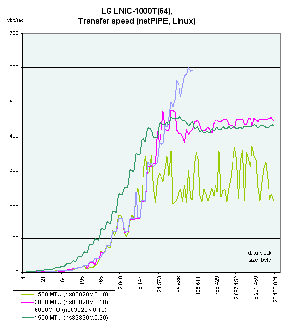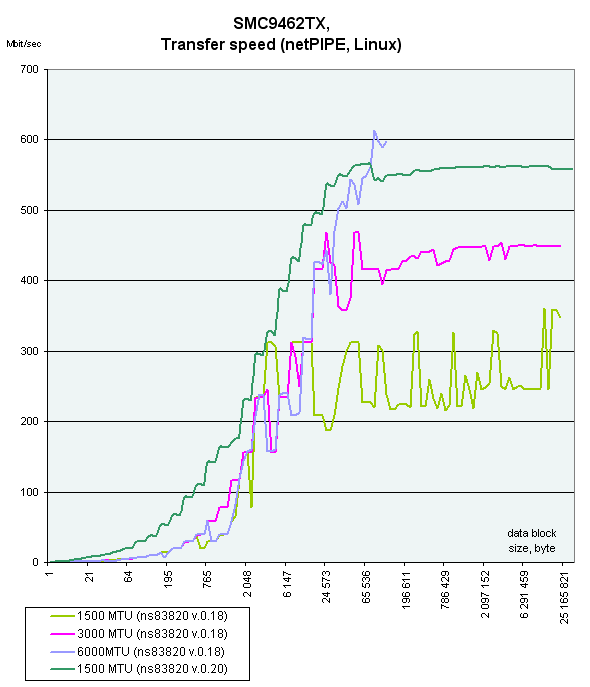 На драйверах версии 0.20 при включении Jumbo-фреймов, в самом начале теста (при размере пакета передаваемых данных больше 1024 байт) адаптер “зависал”. То есть ОС продолжала функционировать, но передача и прием данных прекращались, как будто от адаптера отсоединили сетевой кабель. При использовании драйвера версии 0.18 эта ситуация наступала несколько позже, на MTU = 6000 и при размерах данных для передачи больше 128 КБ. На всех остальных адаптерах с микроконтроллером DP83820 ситуация полностью повторялась.