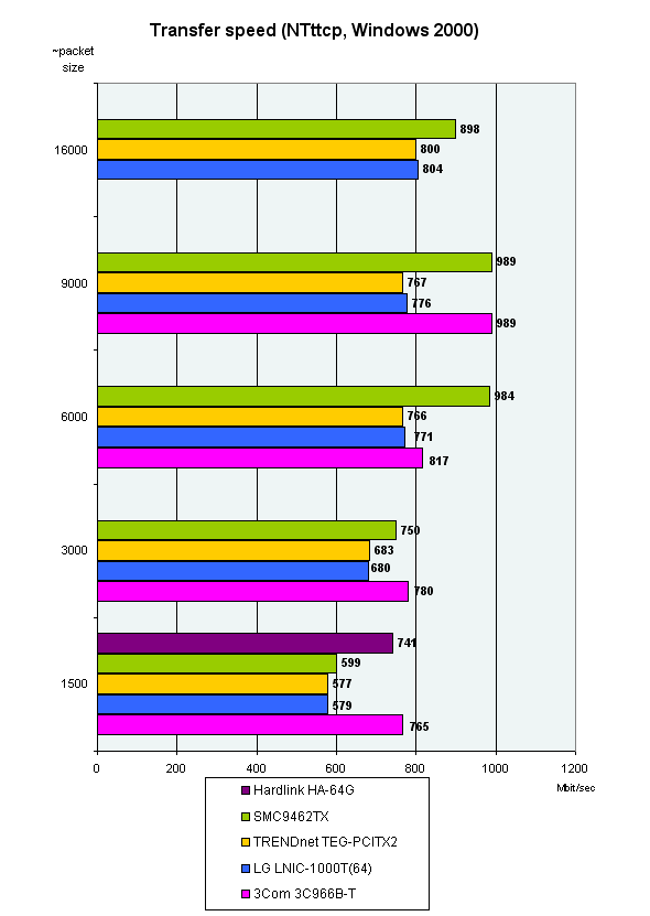 В абсолютном большинстве тестов лидирует адаптер 3Com 3C996B-T, что и ожидалось. За ним с небольшим отрывом следует адаптер Hardlink HS-64G при MTU = 1500. К сожалению, его не удалось протестировать при включенных Jumbo фреймах, но скорее всего распределение карт бы не изменилось. Превосходство этих двух адаптеров над остальными объясняется в первую очередь более новым поколением Ethernet-микроконтроллера, двухчиповые адаптеры появились значительно раньше.