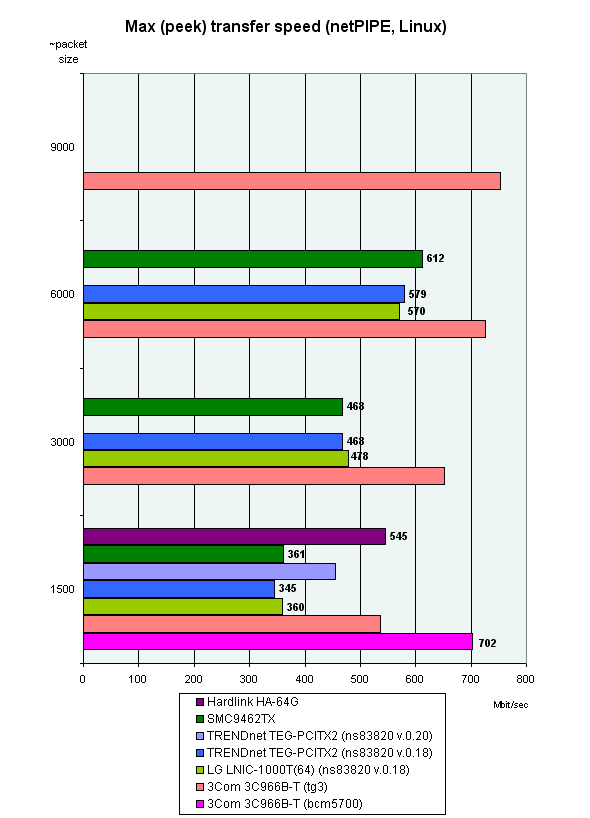 Последней, как обычно, привожу диаграмму пиковых скоростей адаптеров в netPIPE. Картина повторяет вышеописанные, кроме того, что скорости двухчиповых карт сравниваются (адаптер от SMC перестает вырываться вперед).