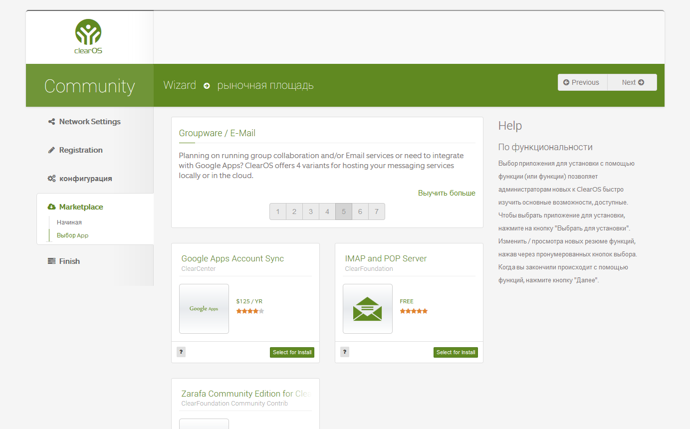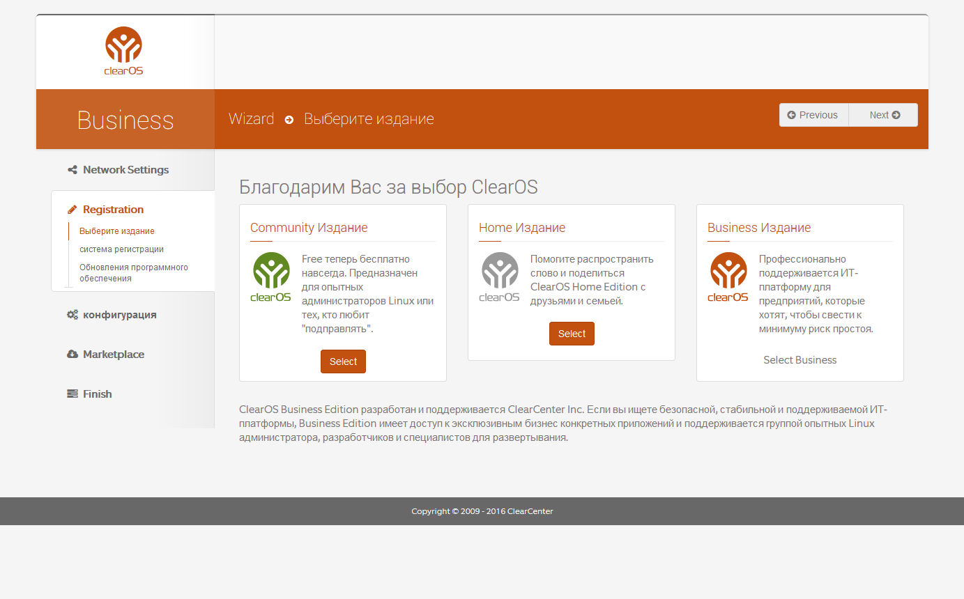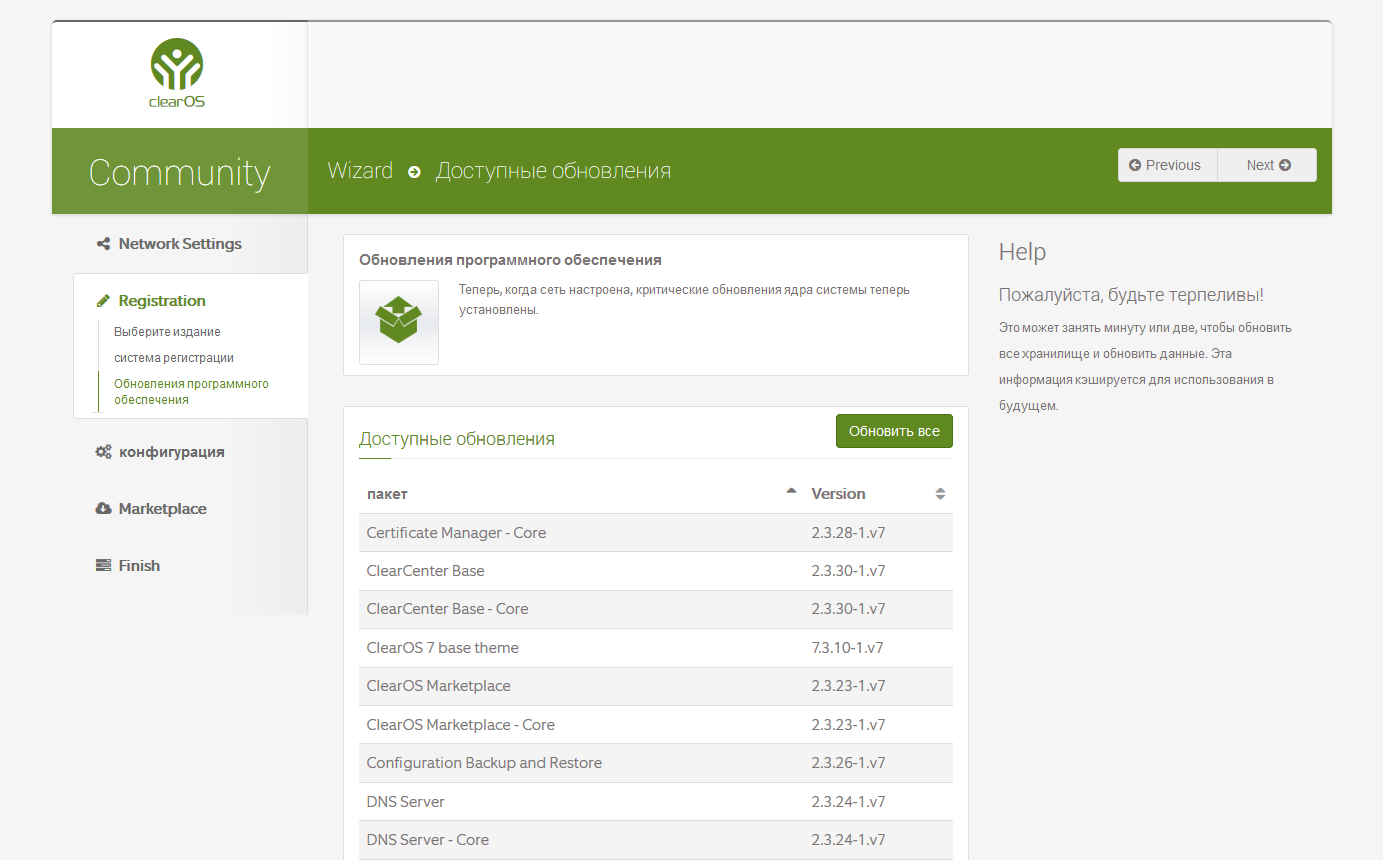 Этапы мастера настройки ClearOS достаточно логичны и понятны: выбор режима (публичный сервер, гейт, локальный сервер), параметры сетевых интерфейсов, выбор версии (комьюнити, домашняя, бизнес), установка обновлений, имя хоста, дата и время, настройка каталога приложений, виджеты для панели управления и так далее.