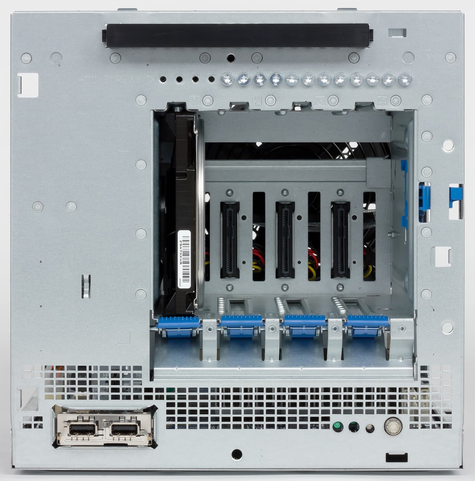 На правом краю крышки есть ручка для ее снятия и около нее индикатор текущего положения замка блокировки. В нижней части передней панели есть два разъема USB версии 3.0 (заметим, что цвет у них черный), индикаторы (два зеленых — активность и сети, один двухцветный — неисправность) и кнопка включения питания со встроенным индикатором.