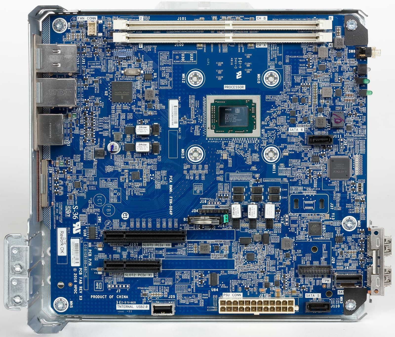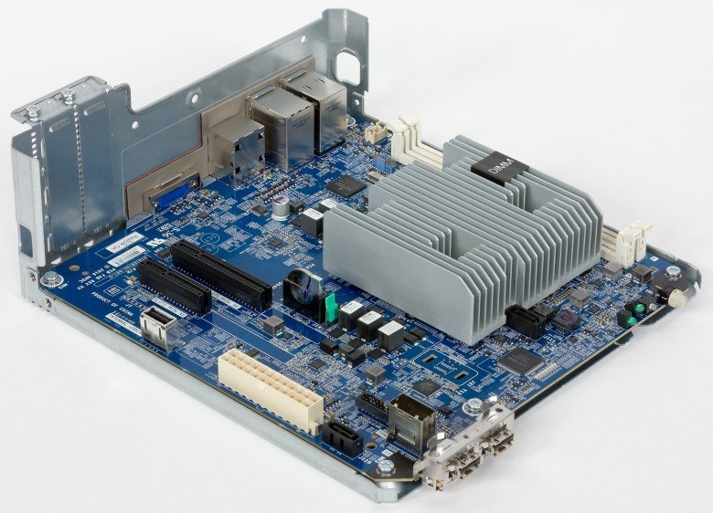 Решение основано на платформе для гибридных процессоров AMD Opteron X3000. Эти решения были представлены пару лет назад и представляют собой энергоэффективные чипы «все-в-одном» для построения таких продуктов как минисерверы, сетевые накопители, системы видеонаблюдения, медиасерверы, маршрутизаторы и других подобных систем. В микросхеме, изготовленной по нормам 28 нм и имеющей расчетную мощность от 12 до 35 Вт собрано 2 или 4 вычислительных ядра с поддержкой 64-битных вычислений, 4-8 графических ядер, контроллер памяти DDR4, а также шина PCIe, цепи ввода-вывода и несколько периферийных контроллеров. Так что никакого традиционного дополнительного чипсета на материнской плате вы не обнаружите.