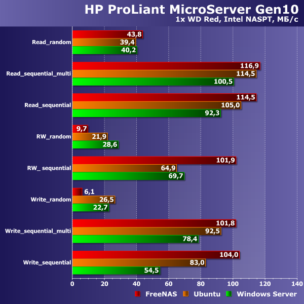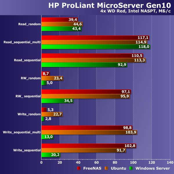 На первом графике приводятся результаты тестирования скорости чтения и записи файлов по сети с клиента Windows 8.1 в бенчмарке Intel NASPT. Сетевое подключение осуществлялось через гигабитный коммутатор. Использовался стандартный протокол SMB. Была проверена работа с томом из одного диска и отказоустойчивая конфигурация массива из четырех дисков — массив с четностью в Windows Server, программный RAID5 в Ubuntu, RAIDZ на FreeNAS. Все настройки по умолчанию, никаких специальных оптимизаций не проводилось.