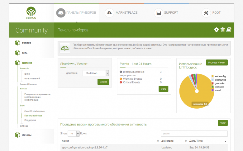 К сожалению, на практике назвать данную ОС удобной и полезной для малого бизнеса, часто не имеющего опытных специалистов, очень сложно. Нам не удалось за разумное время реализовать через предоставляемый разработчиками веб-интерфейс такую простую задачу, как создание общего сетевого ресурса для обмена файлами. Так что перспективы данного продукта представляются достаточно туманными. Возможно в платных версиях ситуация лучше (кроме того, можно пользоваться техноподдержкой), но если хочется готовое решение «из коробки», ClearOS существенно проигрывает готовым сетевым накопителям по удобству и набору сервисов. Да, формально «это просто Linux», и опытный специалист способен решить в нем практически любые задачи, но ему, скорее всего, удобнее взять проверенный и знакомый Debian/Ubuntu/CentOS/FreeBSD, чем связываться с какой-то веб-оболочкой с неудобным интерфейсом. Так что собственно тестированию сервера именно с этой операционной системой совсем не хочется уделять внимания в данной статье. Будем считать, что это просто еще один из многочисленных вариантов Linux, имеющий некоторые особенности, которые части пользователей могут оказаться полезными.