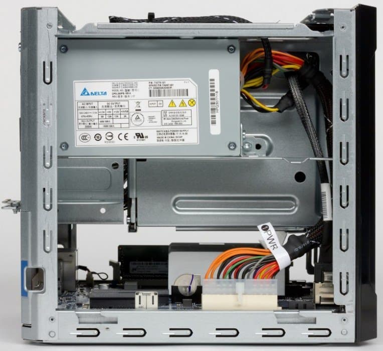 После снятия верхней крышки, что является штатной операций для конечного пользователя, вы получаете доступ к слотам оперативной памяти, слотам расширения и месту установки оптического привода или SSD.
