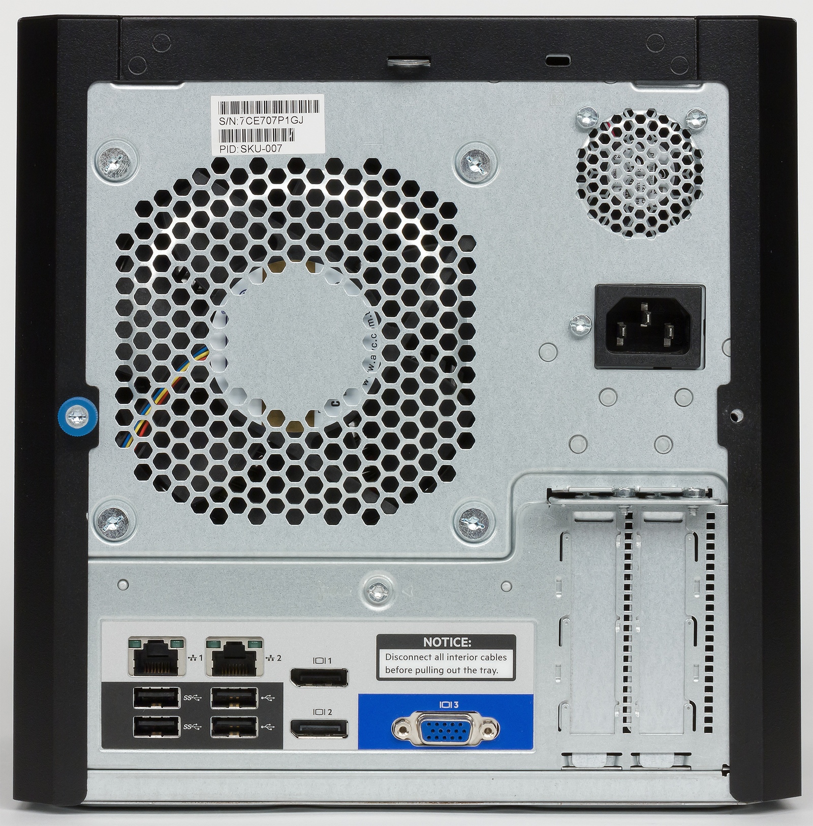 Сзади больше всего места занимает решетка основного вентилятора системы охлаждения. Справа от нее мы видим вход сетевого питания (отдельного аппаратного выключателя питания не предусмотрено) и сетку компактного вентилятора блока питания. В нижней части панели установлены все порты и разъемы: два гигабитных сетевых порта с индикаторами, два порта USB 3.0 (и снова они не выделены цветом), два порта USB 2.0, два видеовыхода DisplayPort 1.2 и один VGA. В правом нижнем углу — место для портов устанавливаемых дополнительно карт расширения.