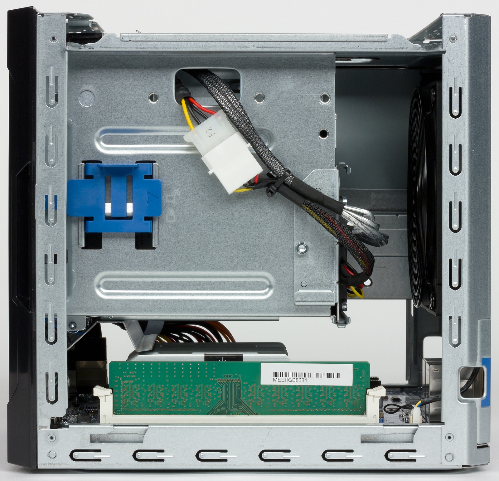 Что касается пятого отсека, который находится в верхней части корпуса, то судя по всему, для установки в него оптического накопителя или SSD потребуются какие-то дополнительные опциональные рамки или крепления. Интересно, что на плате можно также обнаружить еще один порт SATA и он даже работоспособен, так что при необходимости можно расширить общее число дисков до шести, но два из них будут формата 2,5″. Кроме того, при необходимости можно вывести eSATA с этих портов на заднюю панель.
