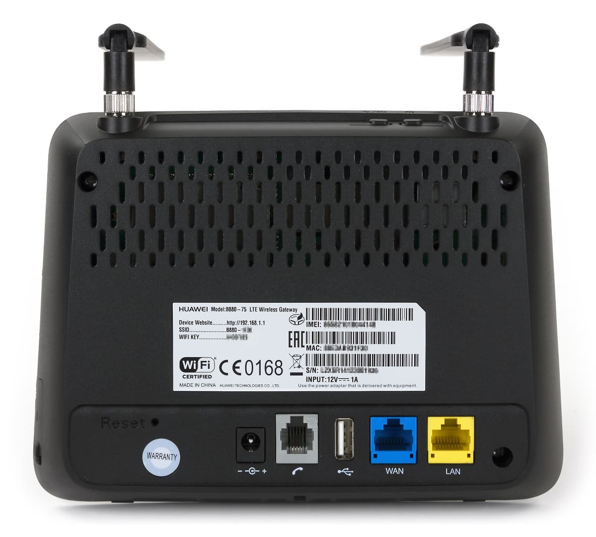 Тестируемая модификация роутера B880-75 поддерживает работу с сотовыми сетями следующих стандартов: GSM (2G) 900/1800 МГц, WCDMA (3G) 900/2100 МГц, LTE (4G) FDD 800/900/1800/2100/2600 МГц и TDD 2600 МГц. Максимальные скорости приема и передачи составляют 150/50 Мбит/с для LTE (Cat4 FDD), 42/5,76 Мбит/с для DC-HSPA+ и 384 Кбит/с для WCDMA. Беспроводной модуль устройства отвечает стандартам 802.11b/g/n и работает в диапазоне 2,4 ГГц с максимальной скоростью соединения 300 Мбит/с. Для проводных подключений предусмотрено два порта со скоростью 10/100 Мбит/с. Кроме того, есть порт RJ11 для телефонного аппарата и порт USB 2.0 для принтера или накопителя.