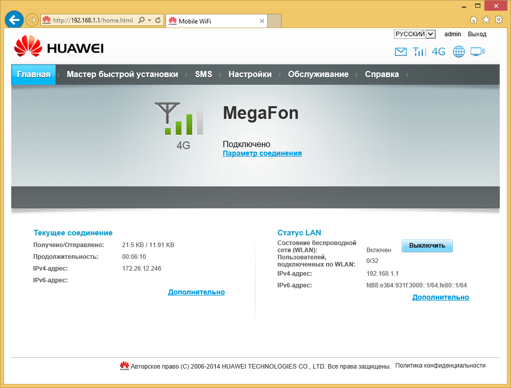 На первой странице, которую видит пользователь после входа, приводится информация о текущем соединении с интернетом и о сегментах локальной сети. Здесь же можно быстро выключить беспроводное соединение.